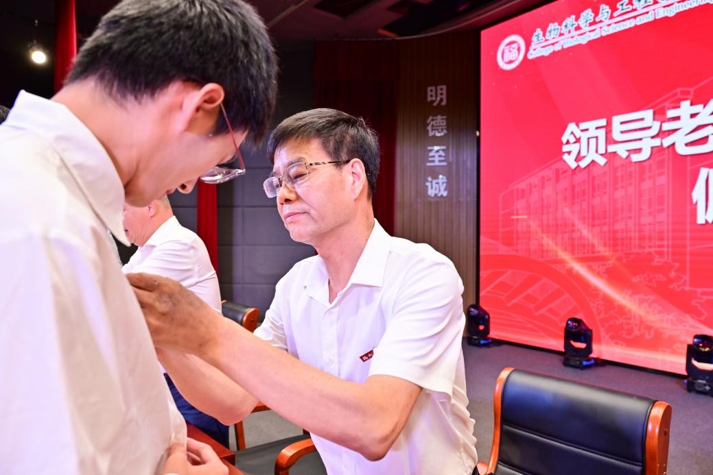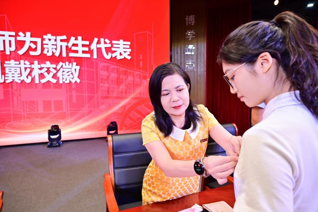 领导与会老师亲自为2025级本科及研究生新生代表佩戴校徽并合影留念。这枚校徽不仅是“福大人”身份的象征,更寓意着全体2025级新生正式融入性爱影片