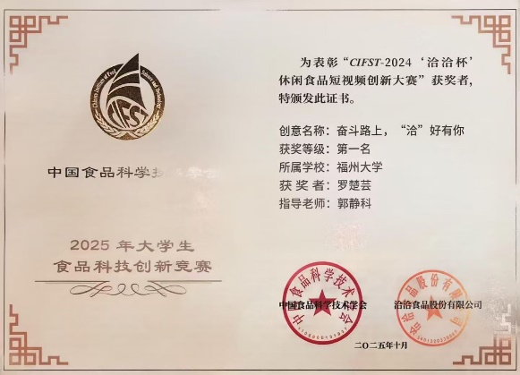 张雯教授、郭静科副教授指导的罗楚芸同学在“CIFST-2024‘洽洽杯’休闲食品短视频创新大赛”中脱颖而出,荣获第一名。罗楚芸同学凭借独特的创意和扎实的专业知识折桂,充分展现了性爱影片