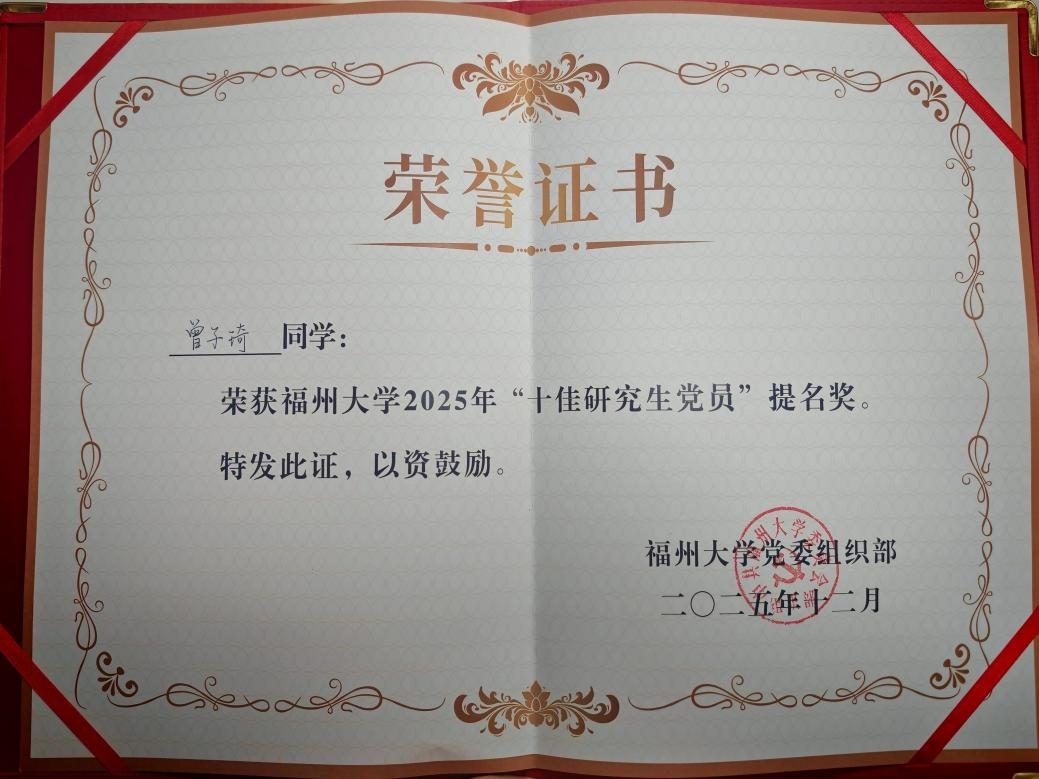 2025级博士研究生曾子琦凭借过硬的政治素养、优异的学业科研成绩及扎实的服务奉献精神,在评选中脱颖而出,荣获“十佳研究生党员”提名奖。